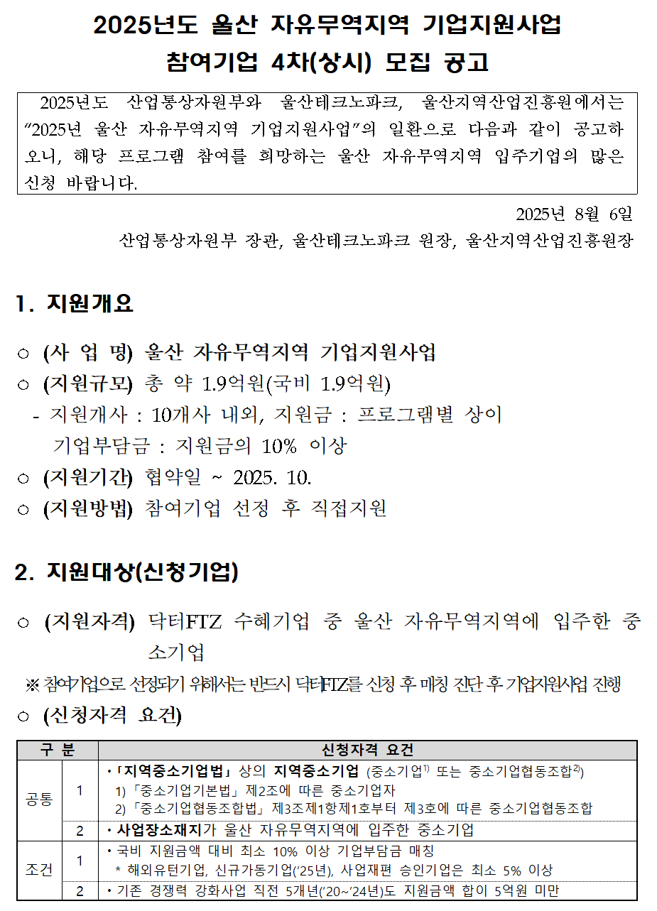 2025년 울산 자유무역지역 기업지원사업 참여기업 4차(상시) 모집공고