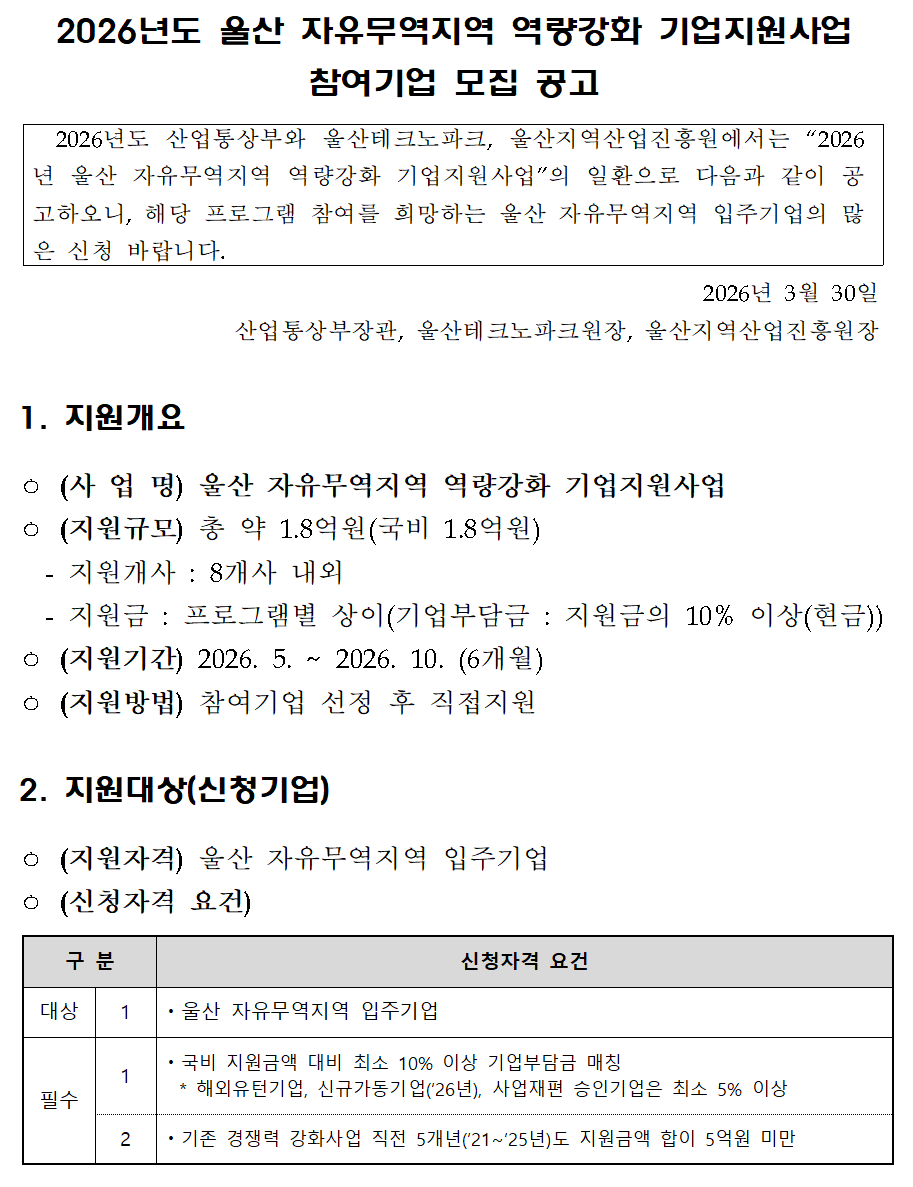 2026년도 울산 자유무역지역 역량강화 기업지원사업 참여기업 모집 공고