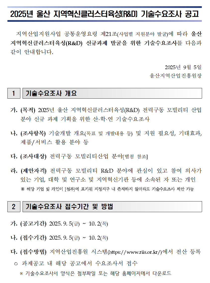 2025년 울산 지역혁신클러스터육성(R&D) 기술수요조사 공고(수정)