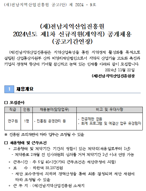 (재)전남지역산업진흥원 2024년도 제1차 신규직원(계약직) 공개채용 (공고기간연장)